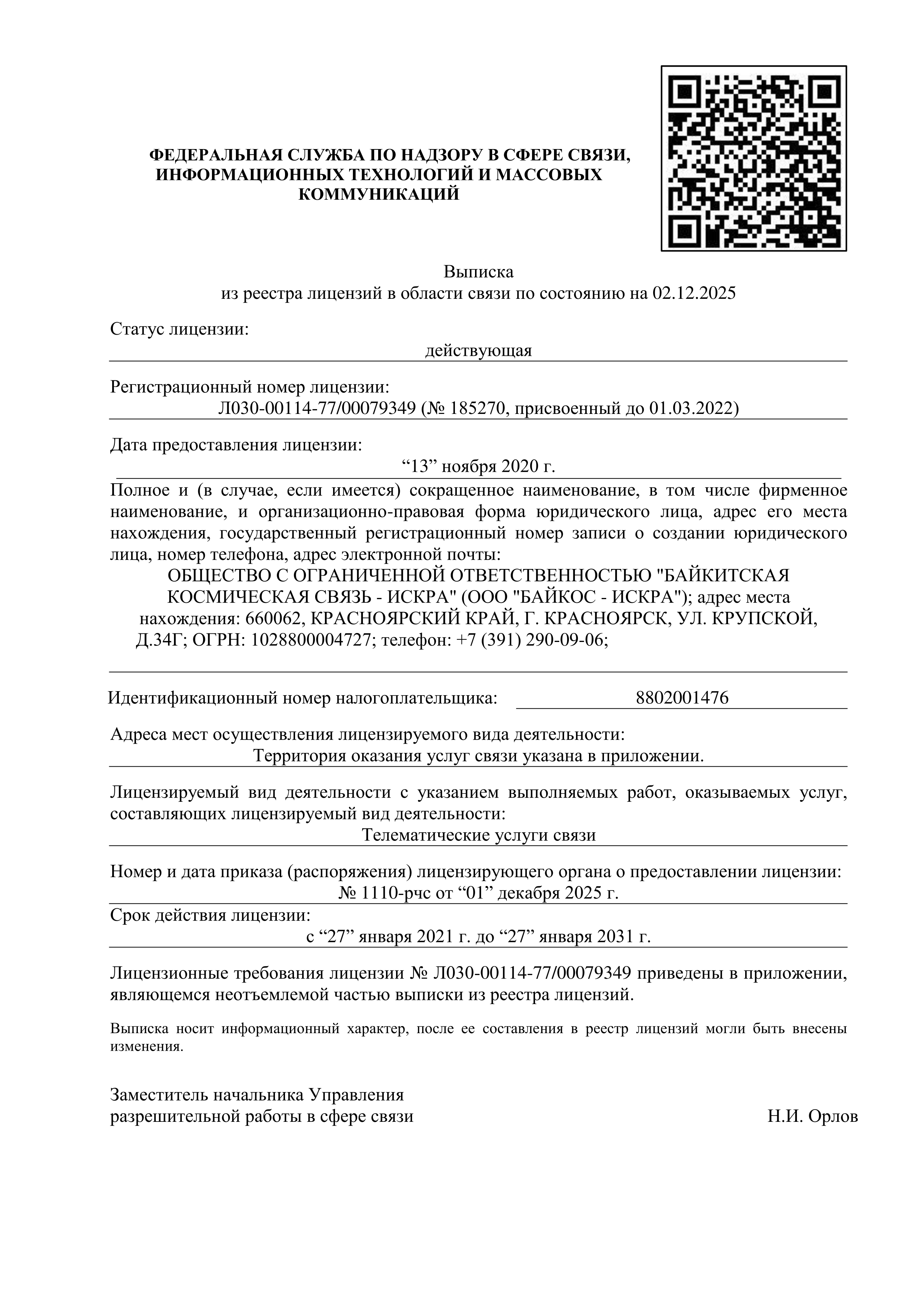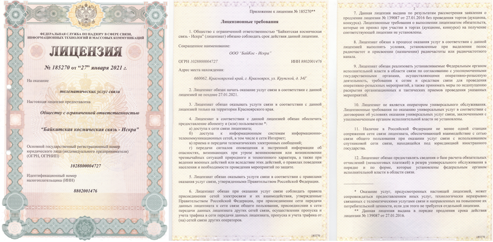 ООО "Байкитская космическая связь - ИСКРА" осуществляет предоставление услуг связи на основании лицензий:
